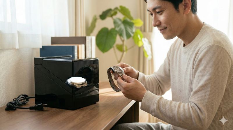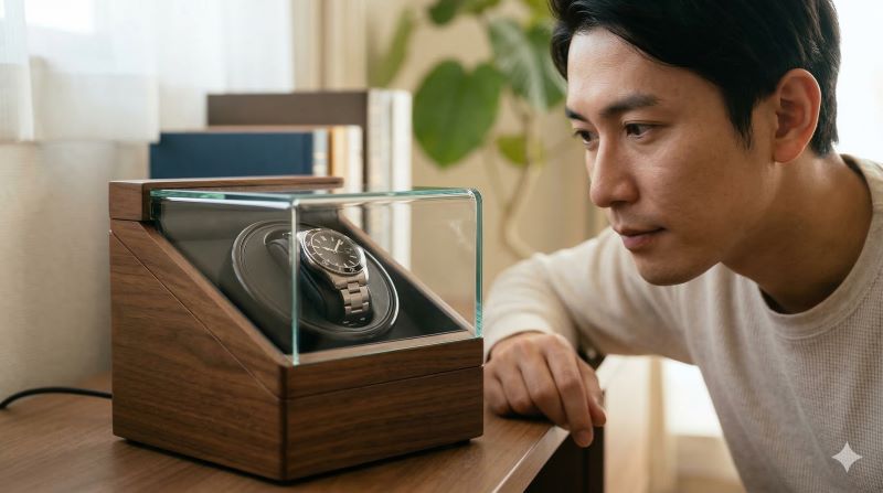 数日外すと止まりやすい自動巻き時計でも、ワインディングマシーンに乗せておけば、着けたいときにすぐ使える状態を保ちやすくなります。