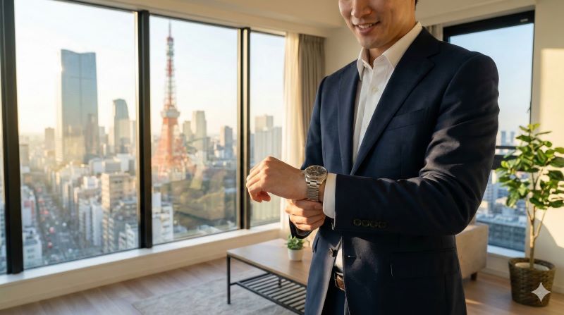 朝、ビジネススーツ姿の日本人男性が高級機械式時計を腕に着用する様子。窓の外には都会の景色が広がり、日常的な時計の使用シーンを表現。