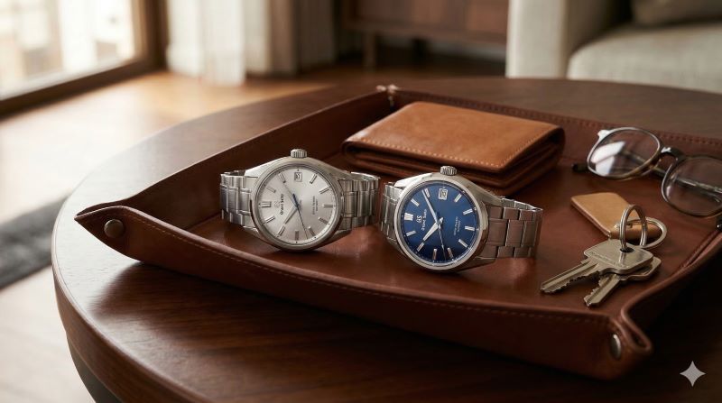 レザー製のバレットトレイに置かれた、80時間などの長いパワーリザーブを持つ2本の高級機械式時計。財布や鍵などの身の回り品と共に、複数本の時計をローテーションする利便性を表現。
