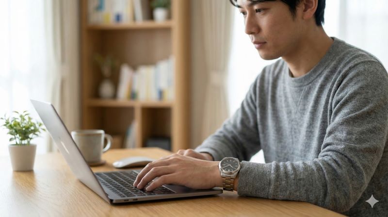 自宅のデスクでパソコン作業をする日本人男性。腕には機械式時計が着用されており、デスクワーク中心の生活で腕の動きが少ない状況を視覚化。