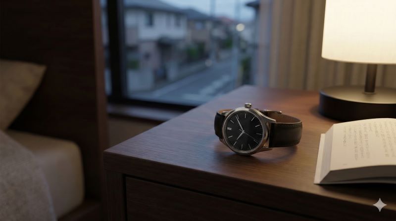 寝室のナイトスタンドに置かれた、パワーリザーブ約40時間の高級機械式時計。ランプと本の横で、翌朝の着用を待つ日常的な風景。
