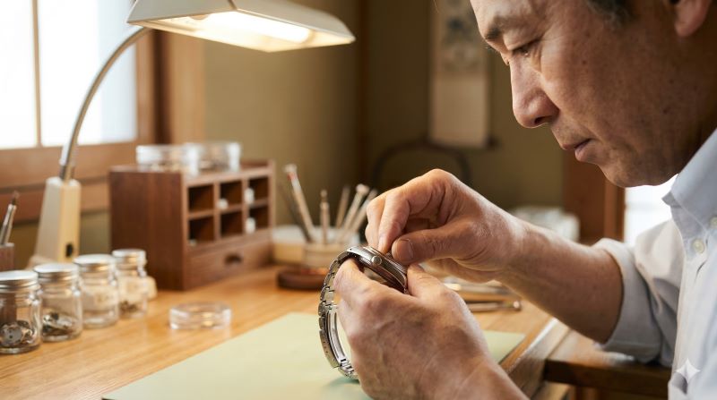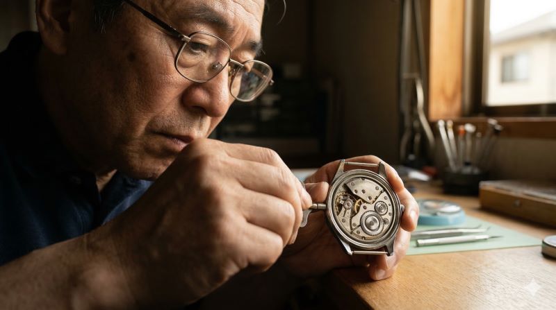 伝統的な時計工房で、日本人時計職人が機械式時計のパワーリザーブを巻き上げている様子。手巻きによるエネルギー補給の儀式。