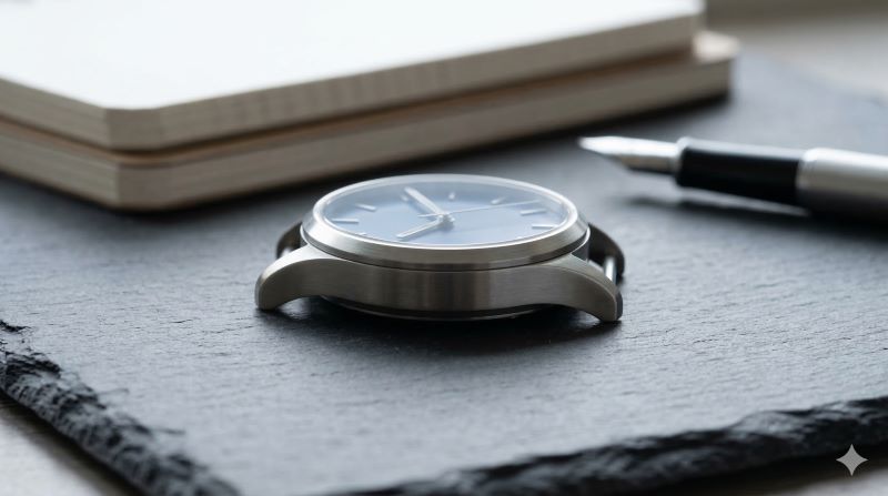 石の表面に置かれた、厚みのあるケースを持つ現代的な機械式時計。ロングパワーリザーブモデル特有のサイズ感を視覚化。